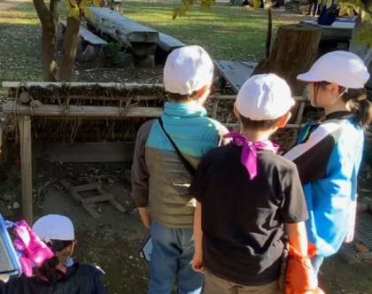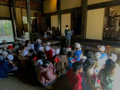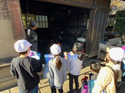 次大夫堀公園に着きました。安藤家の土間でガイドさんから昔の暮らしについてお話しがありました。説明を聞くクラス以外は、班ごとに中の施設を巡りました。