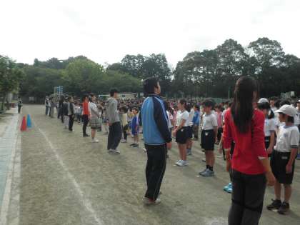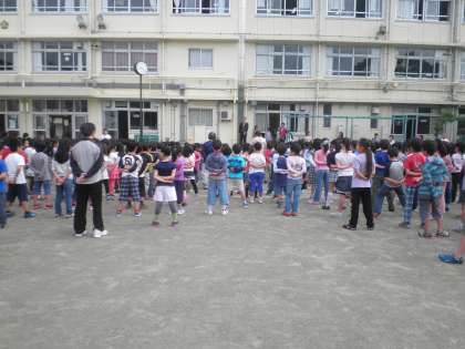 今日は1年生が参加しての初めての児童朝会でした。先生方が前にきちんと並んで挨拶をします。校長先生のお話も1年生は良い姿勢で聞いていました。立派な1年生でした。