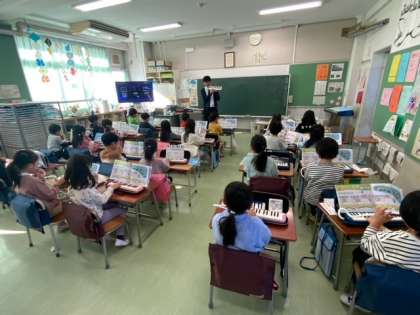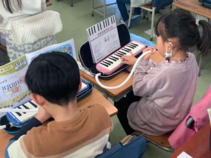 鍵盤ハーモニカで「かえるのうた」を吹いています。指遣いに気を付けて吹くことができています。