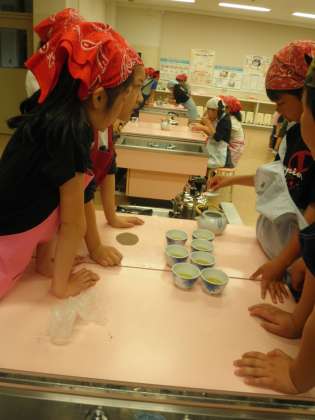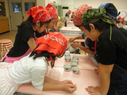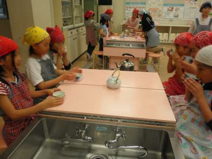 5年生が初めての調理実習をしました。今日は、お湯を沸かして日本茶を入れる練習です。みんな真剣にお茶を入れています。