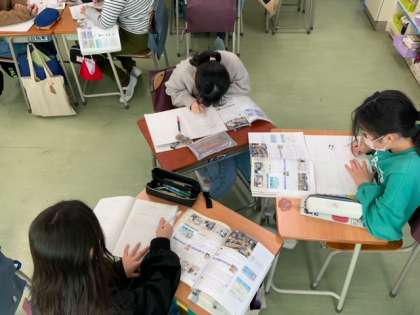 社会科「情報産業とわたしたちのくらし」で、学習課題に向けてそれぞれが調べてまとめていっています。グループや個人でそれぞれのペースで進めています。