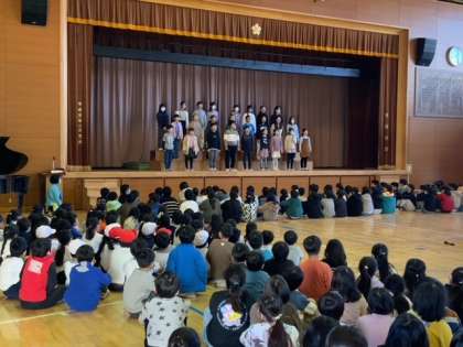 体育館に全校児童が集まり、「北風こぞうの寒太郎」と「たきび」を歌いました。口を大きく開けて、歌詞の情景を思い浮かべながら歌いました。最後には、合唱団から歌のプレゼントがありました。