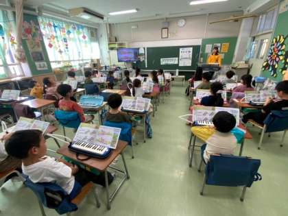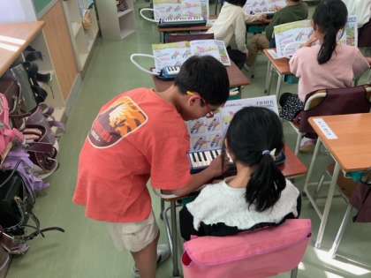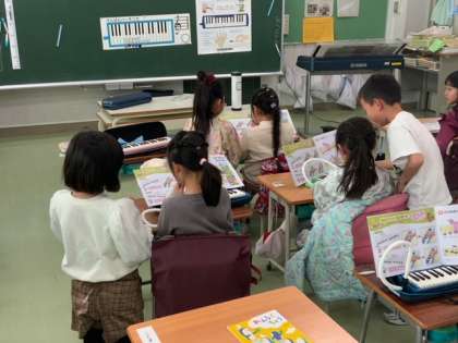 音楽で鍵盤ハーモニカの指くぐりに挑戦します。うまくできないお友達にアドバイスをしていました。