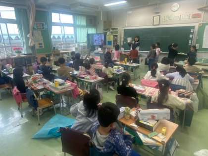 図工でいろいろな箱を組み合わせて、思い思いの動物や物を作っています。とても楽しく取り組んでいます。