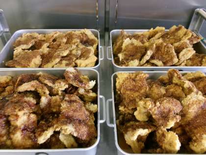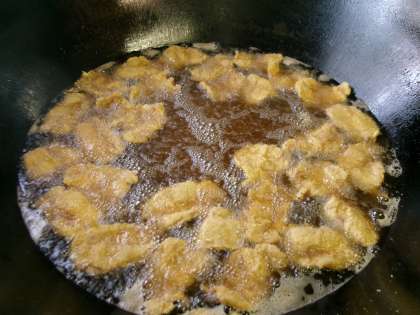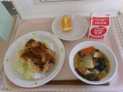 ☆今月は福井県の郷土料理「ソースカツ丼」です。ソースかつ丼は、薄くされた豚肉を、きめ細かいパン粉でカラッと揚げ、熱々のうちにソースに絡めたカツをごはんにのせた料理です。多くの定食屋のメニューから、スーパーの総菜コーナーにもソースカツが並ぶほど、お馴染みのメニューとして県民に親しまれているソウルフードです。給食室では、たくさんのカツを揚げました。ボリューム満点です。
