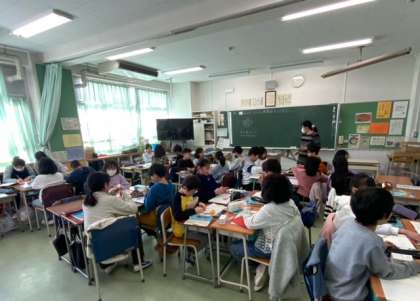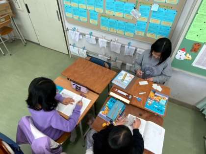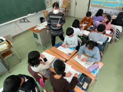算数で、5つの正方形を辺に沿ってつなげたペントミノの展開図を考えていきました。どこが壁でどこが底になるのか、実際に正方形を組み合わせたり、思い浮かべたりしながら作図していきました。
