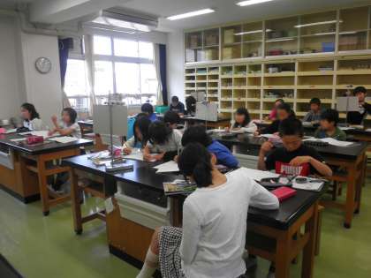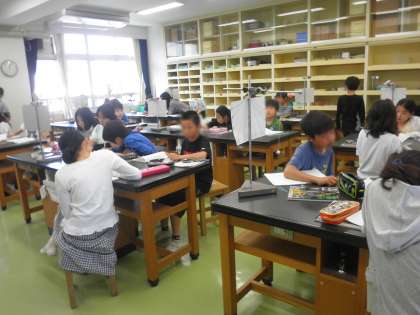 5年生が理科「ふりこの運動」の実験をしていました。ふりこの一往復する時間に関心をもってその性質を調べる実験です。みんな実験結果を一生懸命に書き込んでいました。