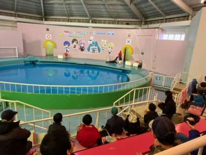 チームに分かれて、乗り物に乗りました。卒業遠足でしょうか、たくさんの学校が訪れていました。アシカショー館をお借りしてのお昼ご飯です。アシカの練習も見られてラッキーでした。
