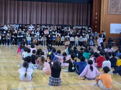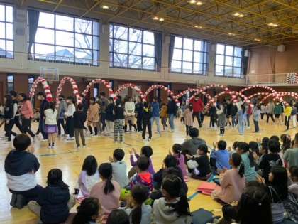 体育館で全校児童が集い、6年生を送る会が開かれました。今までお世話になった、優しくて、かっこいい6年生へ、在校生たちから感謝の言葉や踊り、歌などが披露されました。とても素敵な会で、こちらまで胸が熱くなりました。