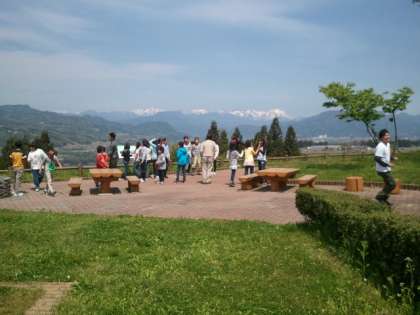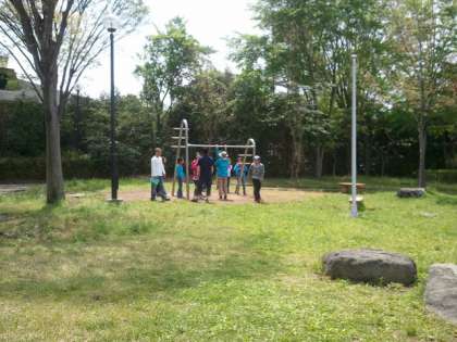 みんなは、広場で鬼ごっこや遊具で遊んでいました。