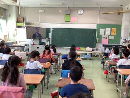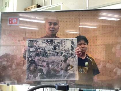 つづいて、「相撲大会」開催のお知らせがありました。昔の烏山小学校の相撲大会の様子の写真と、真新しいまわしに、テレビの前の子どもたちは大盛り上がりでした。相撲大会は中休みに砂場に作った土俵で開催されます。