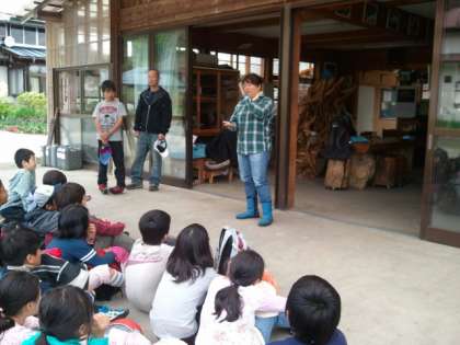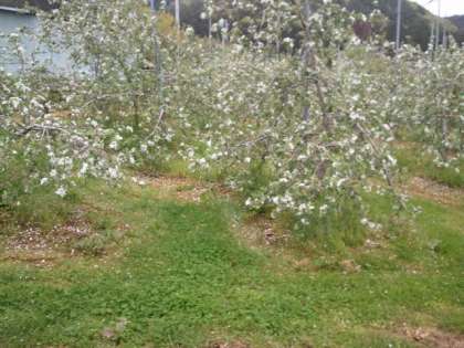 りんごの白い花がとてもきれいです。関りんご園で、りんごジュースを頂いてから、りんご農家のお話をしていただきました。