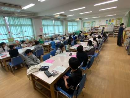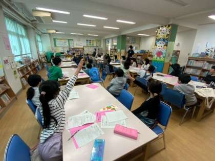 図書の1回目の授業です。司書さんから図書館の本の分類について説明を受けて、クイズにチャレンジしています。
