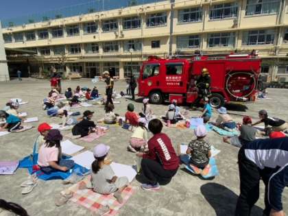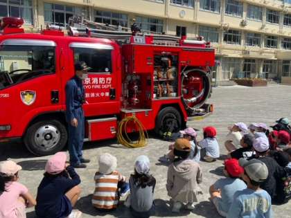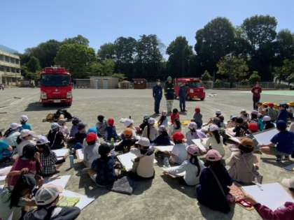 校庭に消防車がやってきました。成城消防署と消防団の方々も来てくださいました。2年生とつくし学級の子どもたちが、はじめに消防士の方からお話しや、消防車の説明もしていただきました。いよいよ画用紙に消防車をかいていきます。