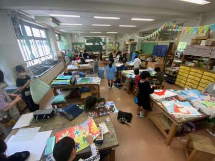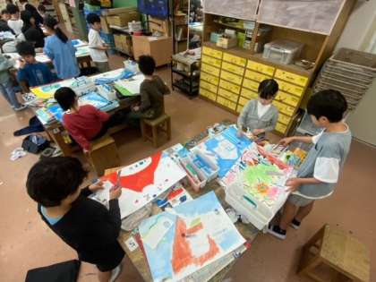 ?図工で、カラーペンや絵の具、クレヨンなどのいろいろな画材を取り入れて『へんてこ山』を描いていきます。
