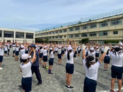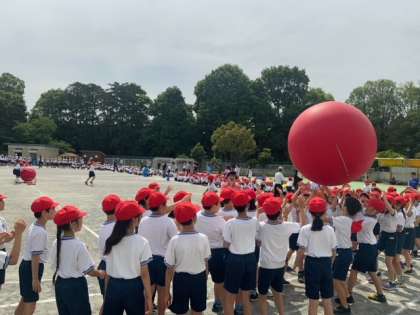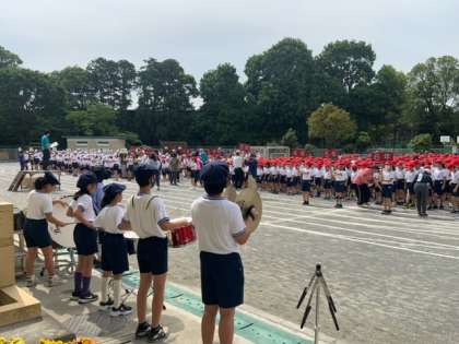 運動会の全校練習で、入場行進や準備体操、全校競技の大玉送りの練習などをしました。