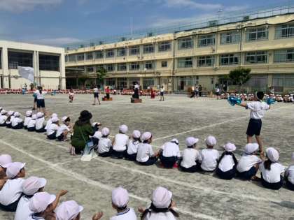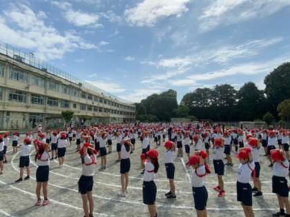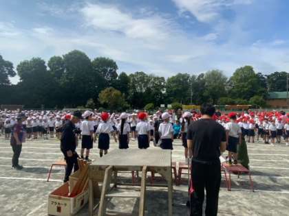 運動会全体練習では、開会式や閉会式、応援合戦などの練習をしました。その中で今年のスローガン発表がありました。
