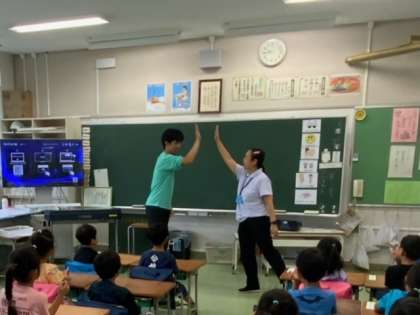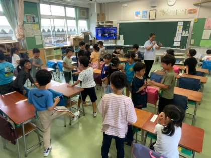外国語活動で、英語でのあいさつをして、ハイタッチをする活動をしています。
