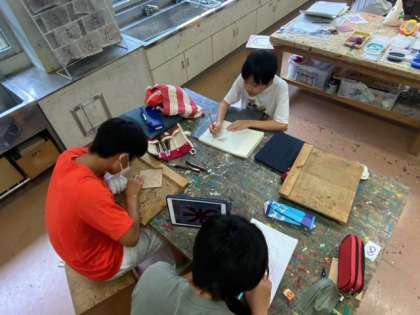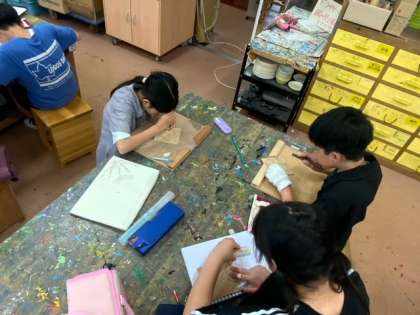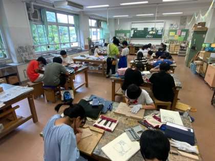 図工でパターン版画に取り組んでいます。彫って、刷り試して、制作を進めています。とても集中して取り組めています。