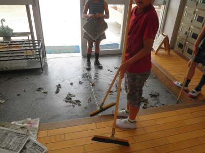 廊下掃除もきちんと雑巾がけをしてしました。玄関掃除では、ほこりが立たないように、主事さんに教わって、新聞紙を濡らしてちぎって掃除をしています。