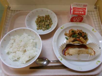 ☆今週は「歯と口の健康週間」です。今日の「のり塩大豆」はカラッと揚げた大豆を、のり塩味にしてスナック感覚で食べることができます。子どもたちには、よく噛んで食べる習慣を身に付けてもらいたいと思っています。