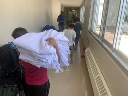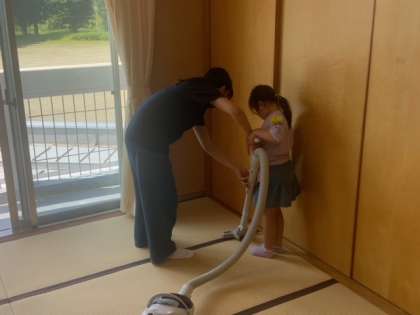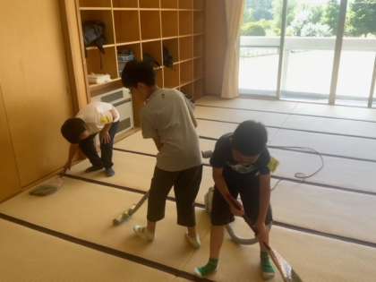 お世話になったお部屋の掃除です。掃除機を交代して、ちり取り、ほうきも使って掃除をします。