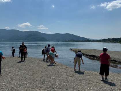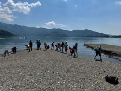 部屋の掃除もテキパキ頑張ったので、時間ができました。河口湖畔までお散歩に行き、石投げをしました。いいお天気です。