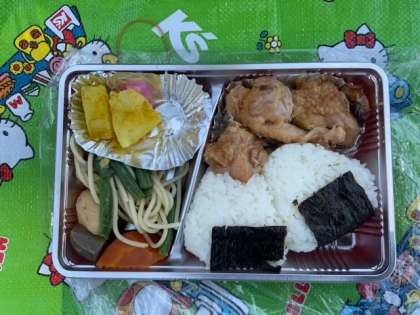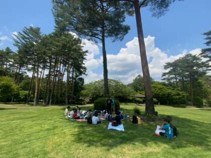 お昼のお弁当です。木陰でとても気持ちがいいです。こんなにいいお天気ばかりの河口湖移動教室は初めてです。