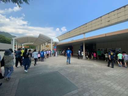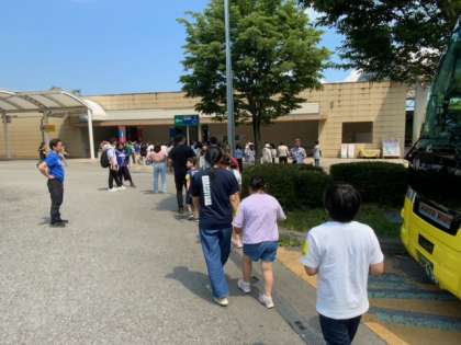 談合坂サービスエリアです。女子トイレが団体でとても混んでいます。外まで列がつながっています。