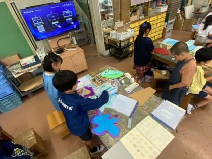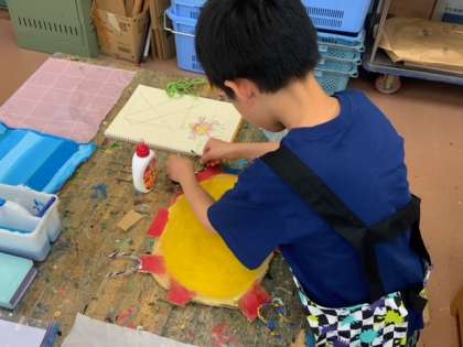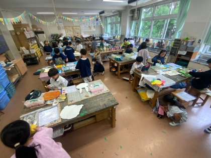 図工で「からす山のようせい」をつくっていきます。ダンボールからドンボールカッターを使い上手に形を切り出しました。色を塗ったり、装飾を付けたりしています。