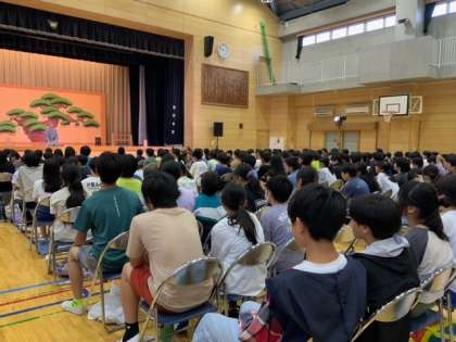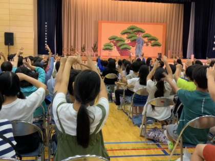 給田小学校の体育に能の舞台が組まれ、烏山小学校と給田小学校の6年生合同での古典芸能鑑賞教室です。附子の演目を鑑賞した後に、ワークショップでは、挨拶や台詞の言い回しや動作などを教えていただきました。