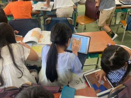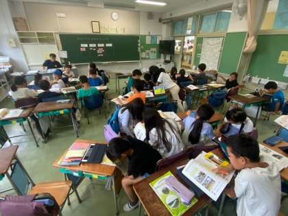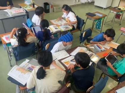 社会科で、世田谷区の土地の様子、土地の使われ方、交通の様子など、自分の進度に合わせて地図に調べて書き込んでいっています。