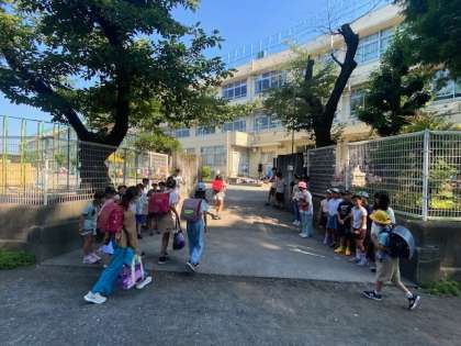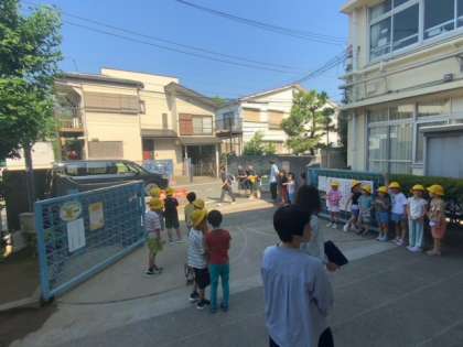 あいさつ週間の取り組みで、1年生と3年生が門に立ってあいさつを呼びかけました。