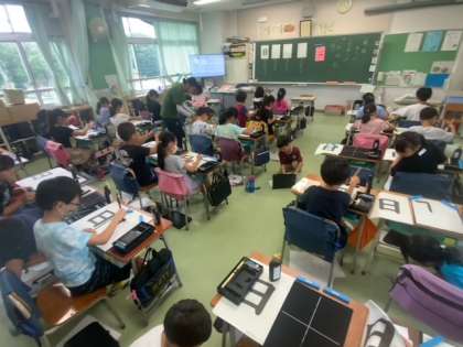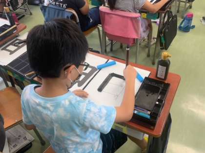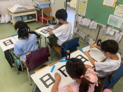 書写の毛筆で「日」を書いています。見本をよく見ながら、丁寧に書くことができています。