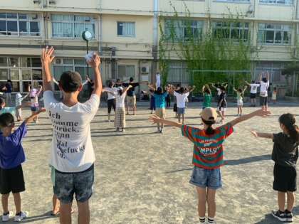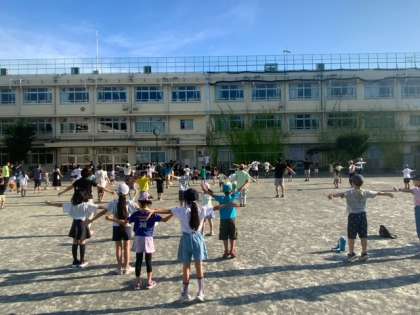 夏休みの初日は、学校の校庭でのラジオ体操です。FATHERS烏山の皆さんが前で見本を示し、大勢の子どもたちや大人、先生方の参加がありました。学校運営委員の皆様方、ありがとうございます。