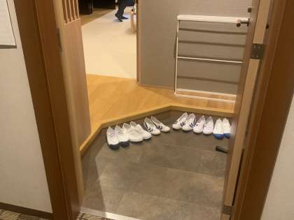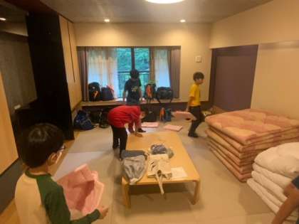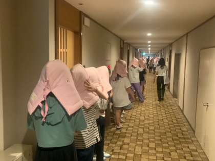 宿での生活が始まりました。各部屋の玄関の上履きもきれいに揃えられています。避難訓練をして、避難経路も確認しました。