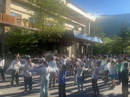 おはようございます。気温17℃、晴れ渡る青空で気持ちのいい朝です。奥日光は、トンボがたくさん飛んでいます。朝会を給田小学校と一緒に行いました。