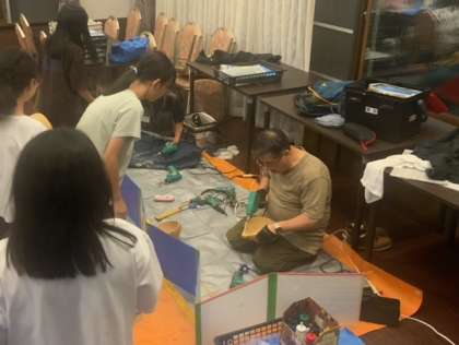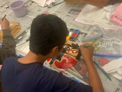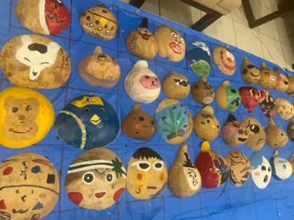 ふくべ細工の工房の方をお招きして体験をしました。一人一人いろいろな形のふくべを一つ選び、事前に考えておいた図柄をチョークで描いていきます。そして、目や鼻など穴を空けてもらいたい人は、工房の方にお願いします。色付けをしていますが、全部塗らないで少しふくべの素材が分かるようにすることがコツです。子どもたちは、夢中になって取り組んでいます。