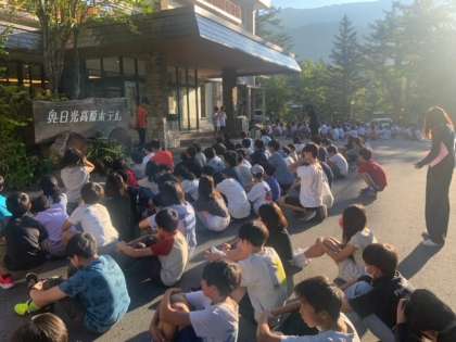 おはようございます。天気は晴れです。気温は19℃でとても涼しいです。朝の会とラジオ体操を今日も給田小学校と一緒に行いました。