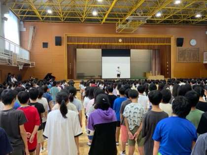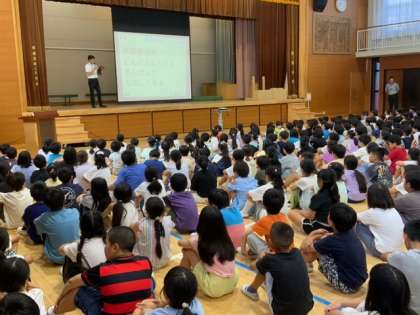 校門で子どもたちを迎えたときに、身長が伸びたと感じました。長い夏休みで様々な経験をしたことでしょう。体育館で始業式を行いました。学校は、夏休みを使って工事がたくさん入ったのでその紹介や、前の校長先生が亡くなられたので、黙祷をしました。その後、校歌を歌い、生活指導がありました。