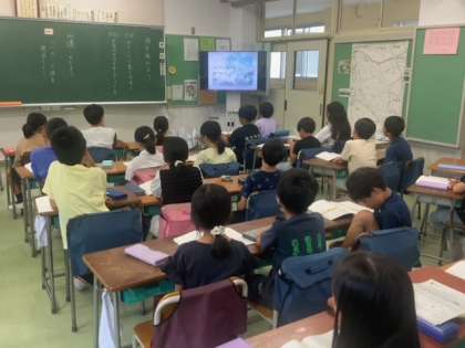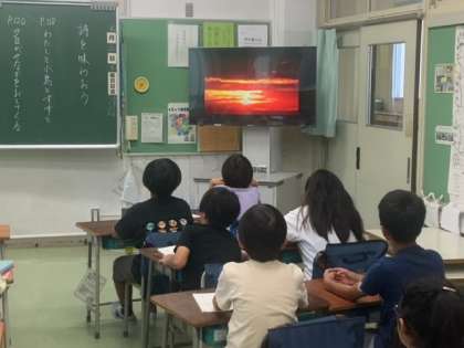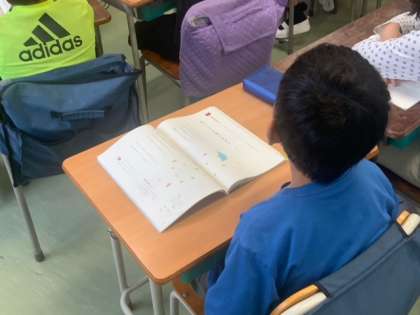 国語で、心に残った詩を視写していきます。「わたしと小鳥とすずと」「夕日がせなかをおしてくる」の歌を聴いてイメージを広げました。あ
