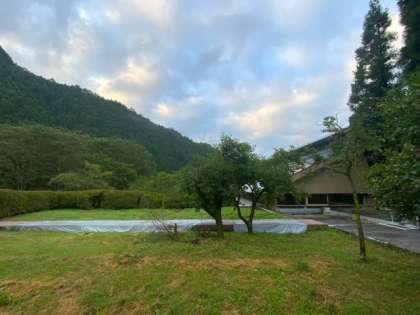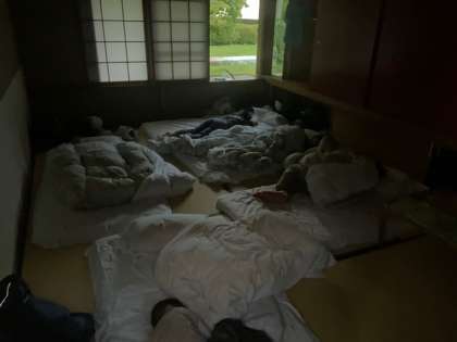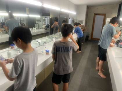 おはようございます。気温は20℃、天気は曇りです。6時前に起きている子どももいますが、6時までは布団の中にいて、静かにしている約束です。起床の放送で、朝の支度をどんどん進めています。