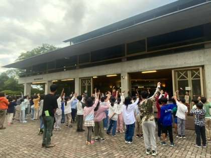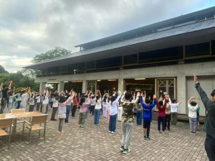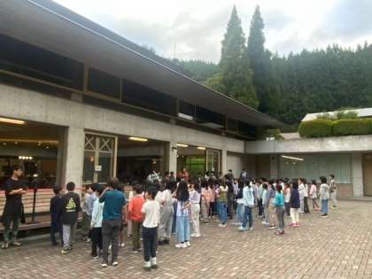 お祭り広場で朝会です。今日も1日、スローガンの実現に向けてがんばっていきましょう。