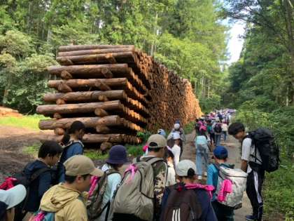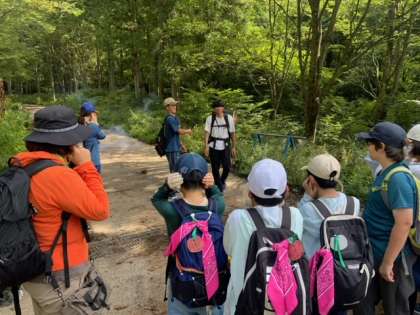 ハイキングに出発しました。林道の入口では、爆竹を鳴らして熊よけをしました。足元は、舗装されていて歩きやすいです。