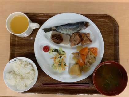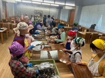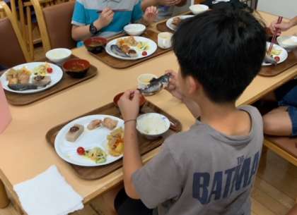 宿舎の食堂での夕食です。川場の名物のこんにゃくやリンゴジュースに加えて、ますつかみのますもメニューに加わっています。食事係さんが朝よりもずっと手際良く準備ができています。