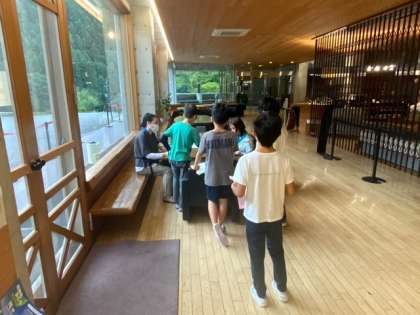 保健係さんが健康観察カードを看護師さんや先生に確認してもらっています。朝会では、全部の班が6時20分の開始に集まれました。行動のメリハリが随分と出てきました。