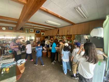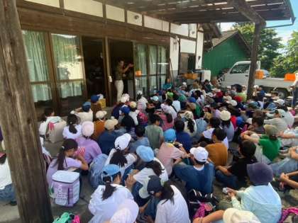 りんご農家さんでまずりんごジュースをいただきました。とっても美味しいと子どもたちが口々に言っています。今の時期のりんご畑の仕事を教えていただきました。りんごにたくさん太陽が当たるようにしているそうです。
