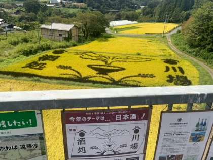 こんにゃく畑が広がっています。吊り橋の下には、田んぼアートがありました。