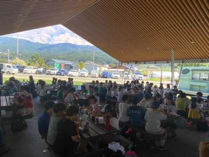 ?田園プラザに到着しました。ここまでよく歩きました。ほぼ平坦な道ですが、日差しが強かったので暑かったです。大きな屋根の下でお弁当を食べます。とうとう川場で食べる最後の食事です。