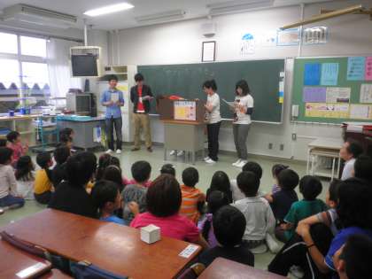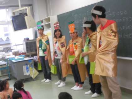今日から学校公開週間が始まりました。1年生は、東京農業大学の古庄先生と学生さんたちが食育の授業として「ベジレンジャー」を実施しました。